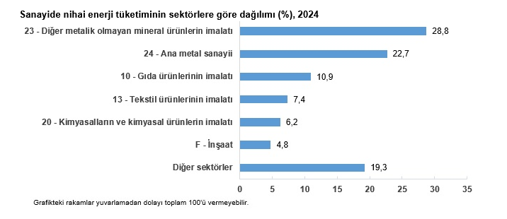 Alt sektörler itibariyle nihai enerji tüketiminde en büyük payı, yüzde 28,8 ile "diğer metalik olmayan mineral ürünlerin imalatı" sektörü aldı. Bu sektörü sırasıyla, yüzde 22,7 ile "ana metal sanayii"; yüzde 10,9 ile "gıda ürünleri imalatı" ve yüzde 7,4 ile "tekstil ürünlerinin imalatı" sektörleri takip etti. "Kimyasalların ve kimyasal ürünlerin imalatı" sektörünün nihai enerji tüketimindeki payı yüzde 6,2 olurken "inşaat" sektörünün payı yüzde 4,8 olarak gerçekleşti.