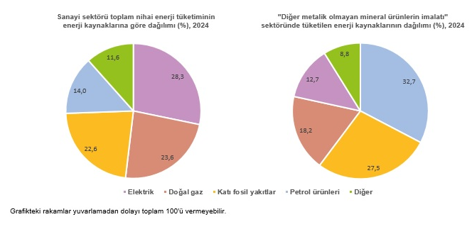 Alt sektörler itibariyle enerji tüketiminin en yoğun olduğu "diğer metalik olmayan mineral ürünlerin imalatı" sektöründe ise en çok tüketilen enerji kaynağı yüzde 32,7 ile petrol ürünleri oldu. Bu sektörde, petrol ürünlerini yüzde 27,5 ile katı fosil yakıtlar, yüzde 18,2 ile doğal gaz ve yüzde 12,7 ile elektrik takip etti.